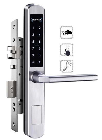 Electronic lock for installation on any door with 85mm locking mechanisms. The stainless steel lock is designed for outdoor installation.
